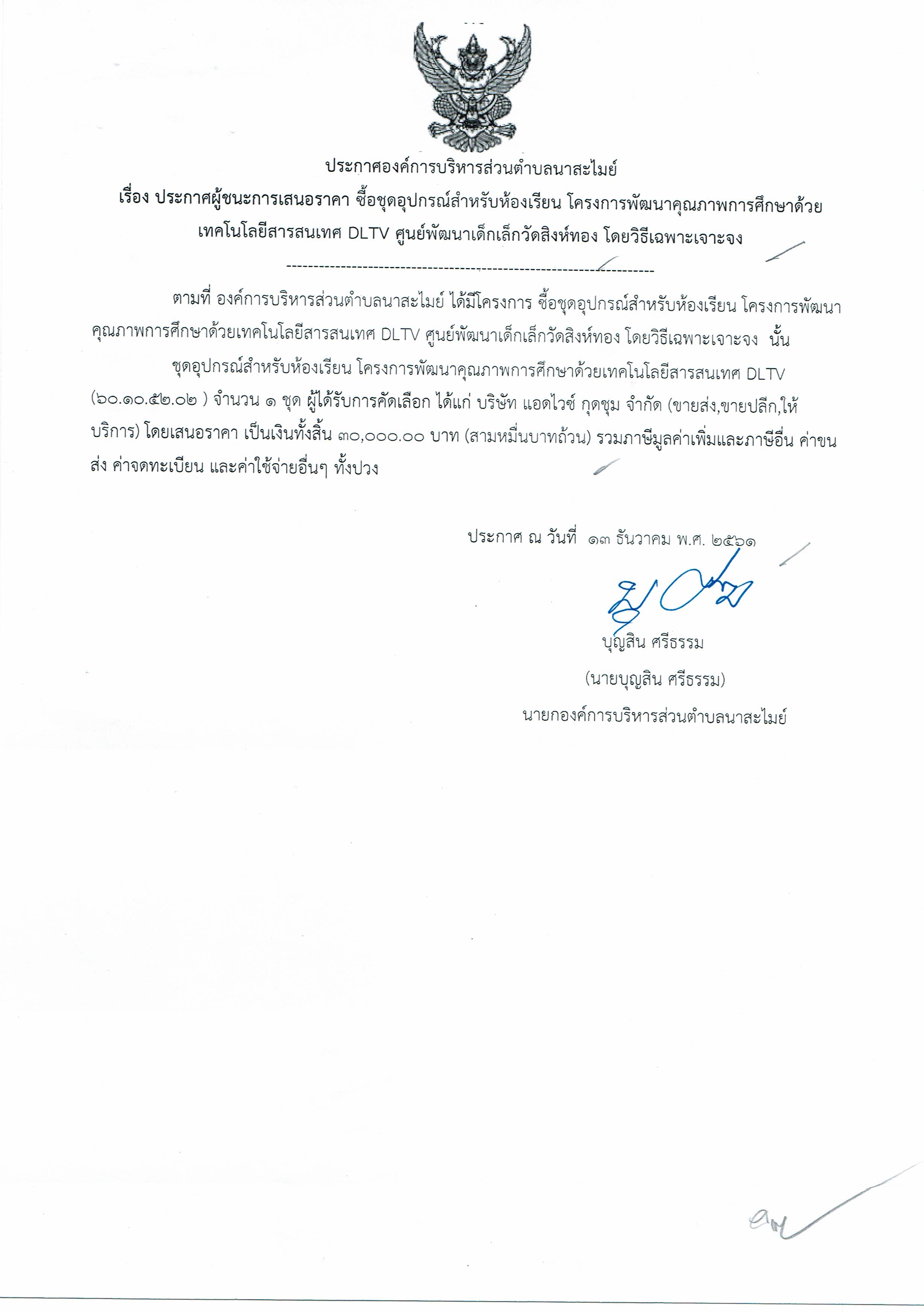 ประกาศผู้ชนะการเสนอราคาซื้อชุดอุปกรณ์สำหรับห้องเรียน โครงการฯ DLTV ศพด.วัดสิงห์ทอง โดยวิธีเฉพาะเจาะจง