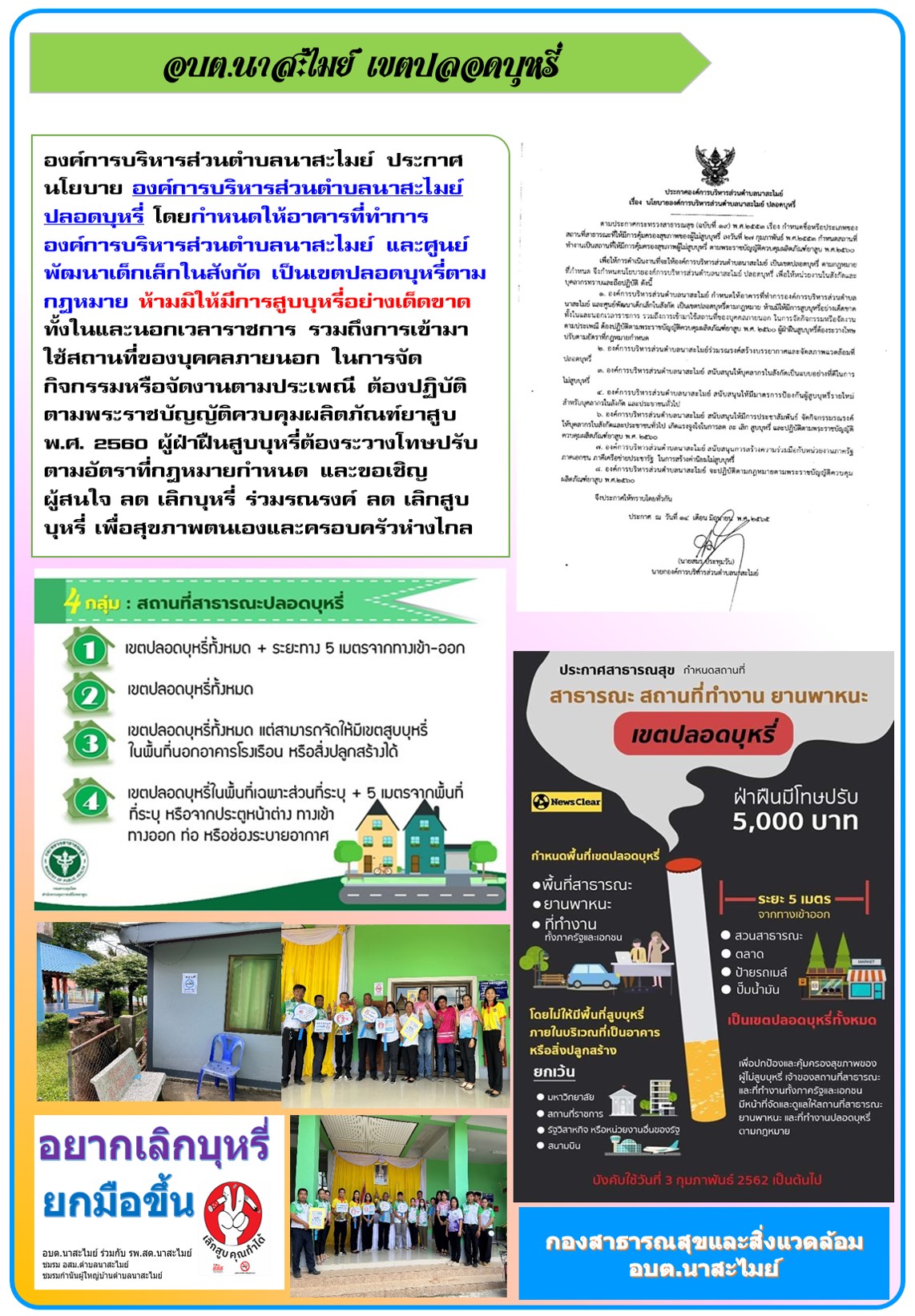 วันพุธ, 31 พฤษภาคม 2566 10:08>>> >>> >>>กิจกรรมรณรงค์และเฝ้าระวังสถานการณ์บริโภคยาสูบในพื้นที่ และกำหนดพื้นที่ห้ามสูบบุุหรี่ >>องค์การบริหารส่วนตำบลนาสะไมย์ กำหนดนโยบายเขตปลอดบุหรี่ โดยกำหนดให้อาคารที่ทำการองค์การบริหารส่วนตำบลนาสะไมย์ และศูนย์พัฒนาเด็กเล็กในสังกัด เป็นเขตปลอดบุหรี่ตามกฎหมาย ห้ามมิให้มีการสูบบุหรี่อย่างเด็ดขาด ทั้งในและนอกเวลาราชการ รวมถึงการเข้ามาใช้สถานที่ของบุคคลภายนอก ในการจัดกิจกรรมหรือจัดงานตามประเพณี ต้องปฏิบัติตามพระราชบัญญัติควบคุมผลิตภัณฑ์ยาสูบ พ.ศ. 2560 ผู้ฝ่าฝืนสูบบุหรี่ต้องระวางโทษปรับตามอัตราที่กฎหมายกำหนด และขอเชิญผู้สนใจ ลด เลิกบุหรี่ ร่วมรณรงค์ ลด เลิกสูบบุหรี่ เพื่อสุขภาพตนเองและครอบครัวห่างไกลมะเร็งปอด ส่งเสริมสนับสนุน ใครอยากเลิกบุหรี่ สามารถขอข้อมูลหรือประสานงานส่งต่อการเลิกบุหรี่กับประชาชนที่สนใจ โดยสามารถลงชื่อเพื่อขอเข้าร่วมกิจกรรมเลิกบุหรี่ได้ >> และร่วม รณรงค์และเฝ้าระวังสถานการณ์บริโภคยาสูบในพื้นที่ โดยความร่วมมือของทีม รพ.สต.นาสะไมย์ ทีม อสม.ในพื้นที่ และ อบต.นาสะไมย์ ลดละเลิกบุหรี่