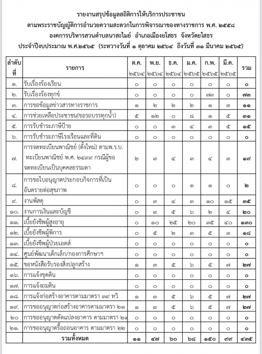 รายงานข้อมูลสถิติการให้บริการประชาชนตามภารกิจของหน่วยงาน ประจำปี พ.ศ.2565 องค์การบริหารส่วนตำบลนาสะไมย์